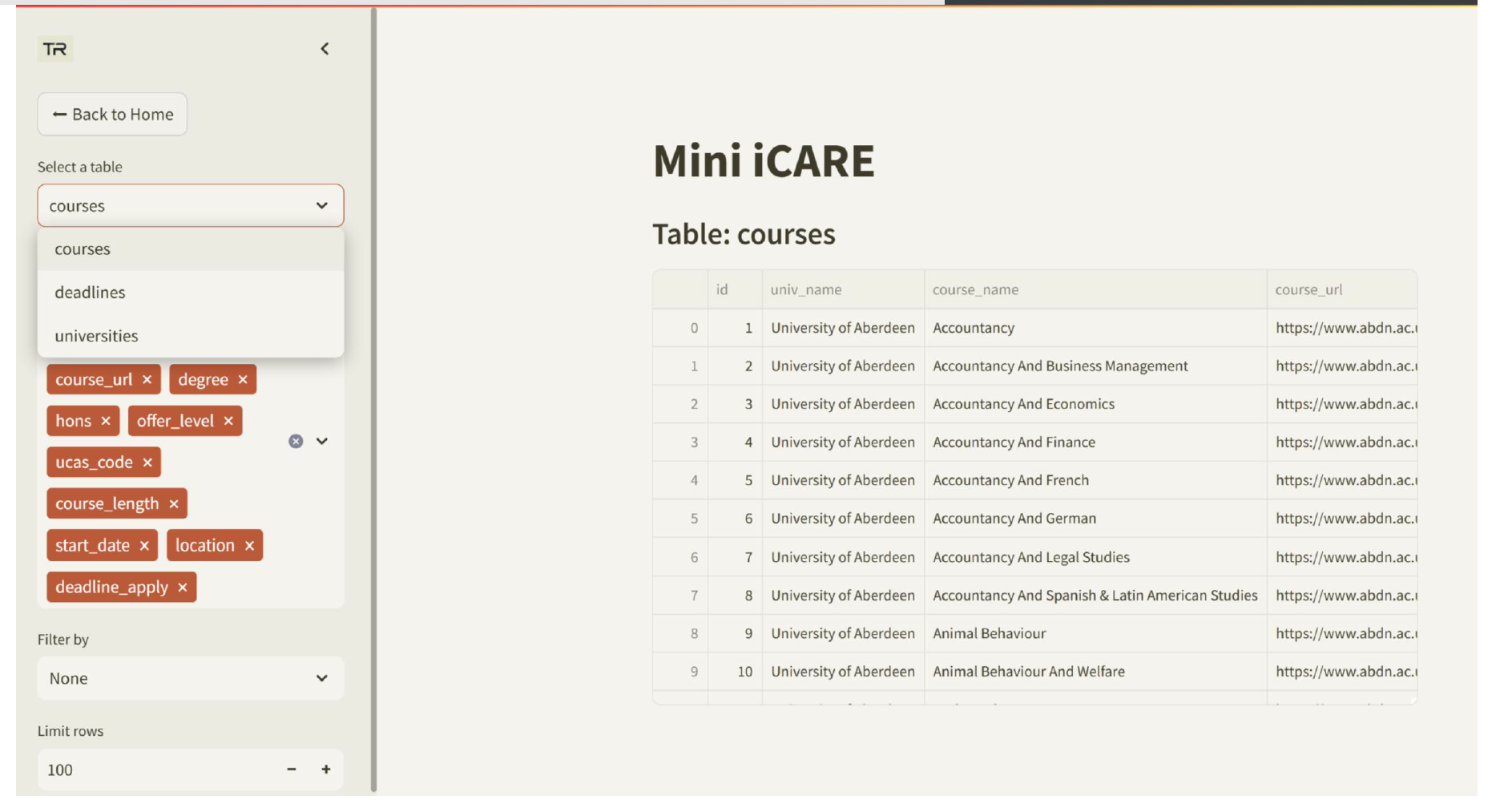 A modular Python tool that automatically crawls university websites to extract and organize undergraduate admissions information into a searchable database with an interactive dashboard. No technical expertise required to explore the data. Features - Intelligent Web Crawler: Navigates from university homepages to undergraduate admissions pages and relevant subpages using heuristic rules - Comprehensive Data Extraction: Captures application deadlines, course lists, requirements, and scholarship information - SQLite Database: Structured storage with relational tables for universities, courses, and deadlines - Interactive Dashboard: Streamlit-based interface for filtering, sorting, and exploring data without writing SQL - URL Validation: Checks if universities are already in the database before scraping Architecture University URL → UniversityScraper → Extract Data → SQLite Database → Streamlit Dashboard For more info click here. |